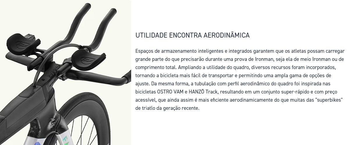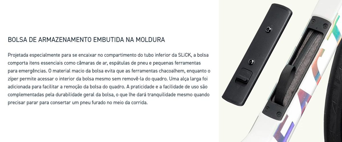 A Slick combina características que aumentam sua utilidade em treinos e competições, incluindo espaços de armazenamento integrados no quadro e opções amplas de ajuste para adaptação precisa ao ciclista. O design foi concebido para simplificar o transporte da bicicleta e permitir ajustes de fit amplos e precisos, enquanto o cabeamento interno e a compatibilidade com componentes eletrônicos proporcionam uma montagem limpa e eficiente. O quadro é fabricado em Toray com Nippon Graphite Pitch-Based Fiber, acompanhado de garfo específico Slick Wide Stance Fork e cabeamento interno para eletrônicos, com freios a disco com alavanca que utiliza carbono na composição, garantindo leveza, rigidez estrutural e frenagem eficiente com alto nível de controle com uma geometria voltada para conforto e performance em triathlon.