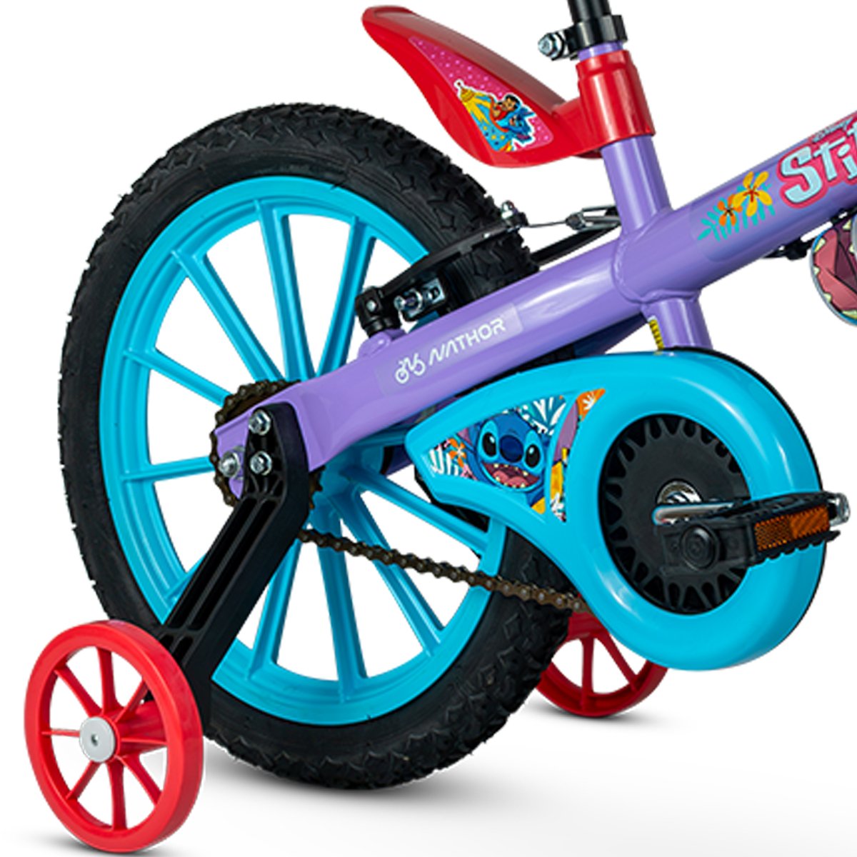 A Nathor é reconhecida por desenvolver bicicletas com design incontestável para crianças que além de pedalar, não descuidam da estilo. Este modelo conta com aros em ABS proporcionando mais estilo e segurança a bike, além de ter pneus com câmara, quadro em aço, uma pequena caramanhola que fica anexada ao tubo e rodinhas laterais de apoio. Além do mais, Nathor Stitch possui também limitador de giro do guidão, importante característica que evita com que guidão dê uma volta completa e danifique o freio, além de preservar a integridade física da criança.