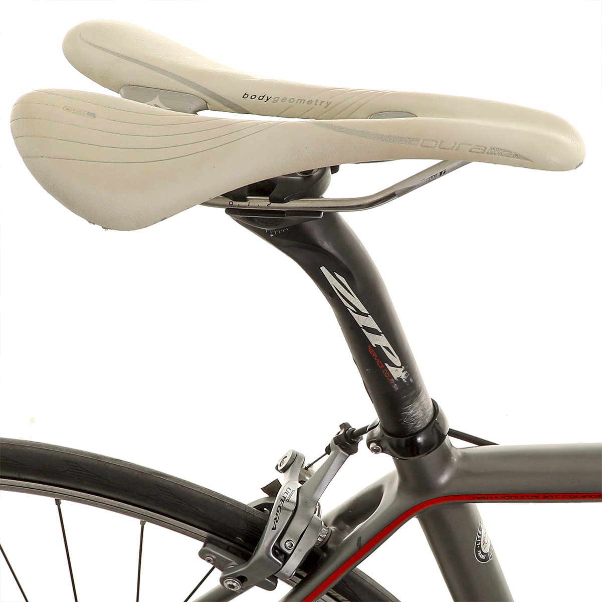 O conjunto de cockpit Zipp em alumínio, aliado ao selim Specialized Oura Gel com trilhos em Ti, reforça o foco em controle, conforto e eficiência, completando um setup bem distribuído para uso em estrada.