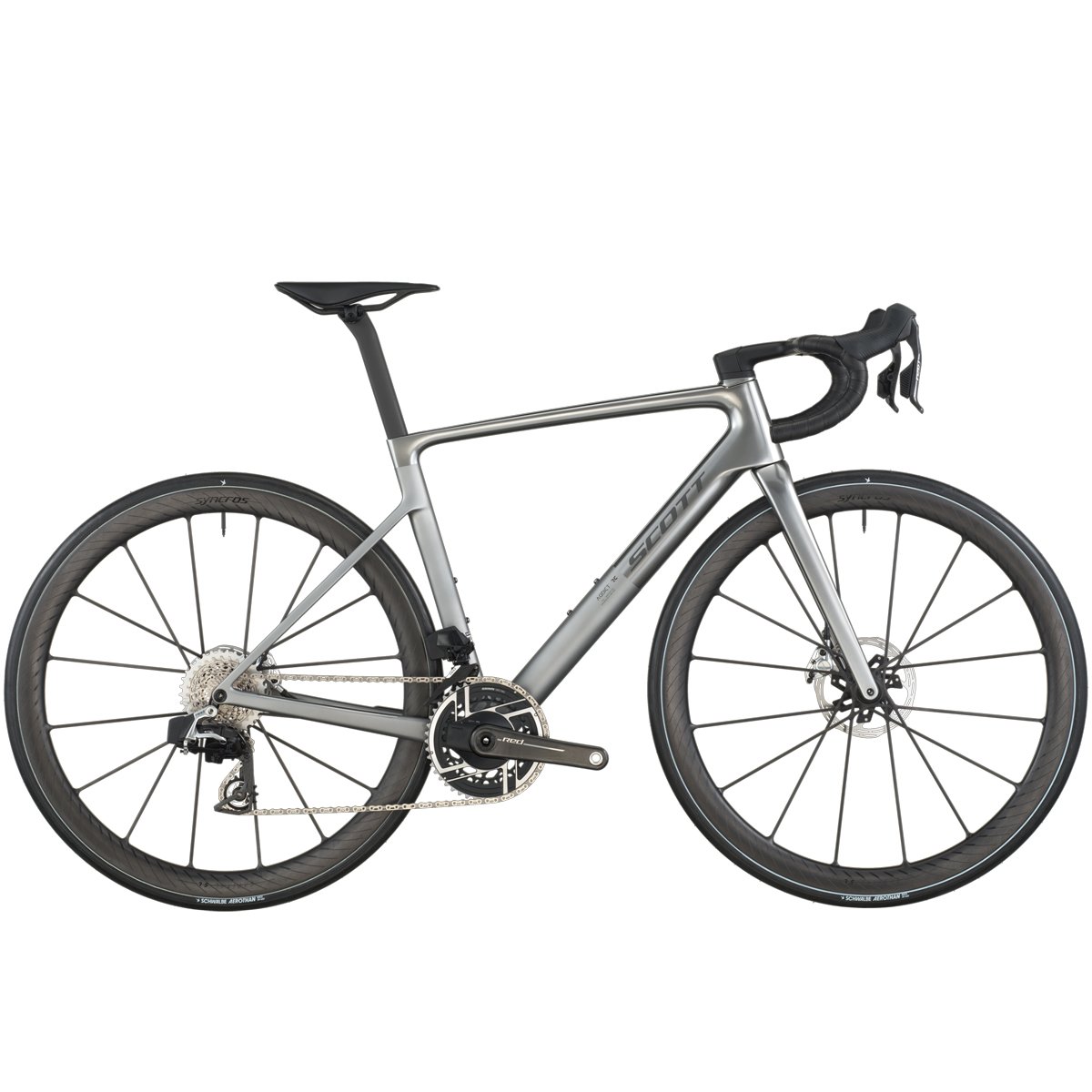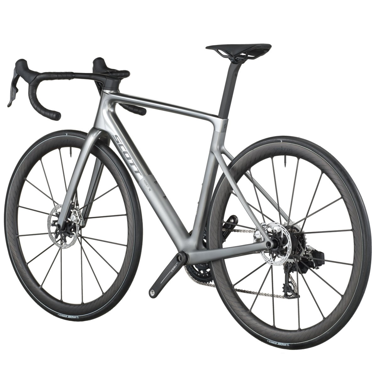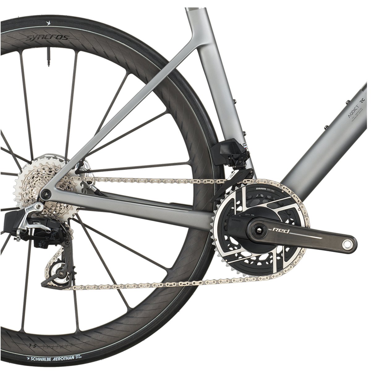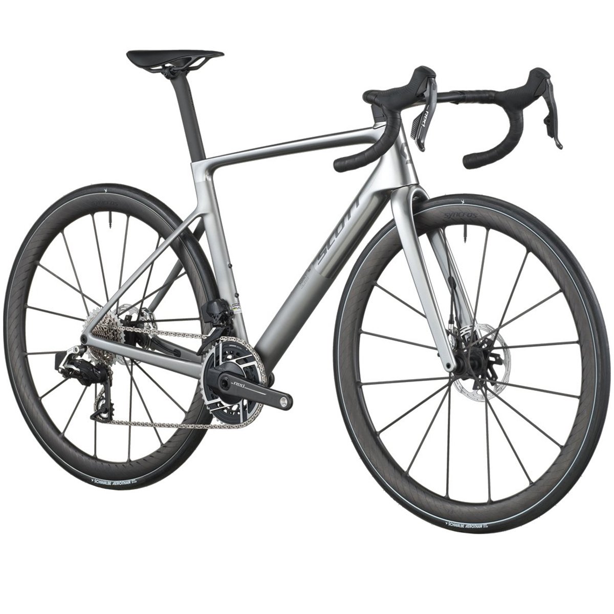 Componentes otimizados de fábrica: pedivela com Power Meter, rodas de carbono leve Syncros Capital SL 40mm, pneus Schwalbe Aerothan/TL‑Easy de alta performance — tudo configurado para máxima eficiência.