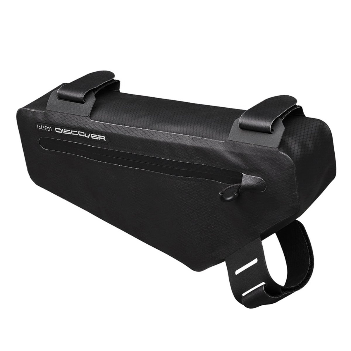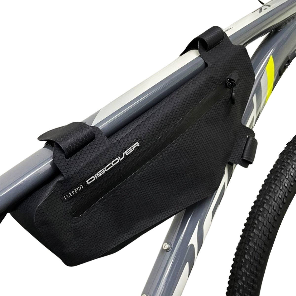 A construção da bolsa é à prova d'água, apresentando costuras soldadas e zíperes protegidos que impedem a entrada de água, garantindo a segurança dos objetos armazenados em condições climáticas adversas. A fixação ao quadro da bicicleta é feita através de tiras de velcro ajustáveis, que permitem um encaixe seguro e adaptável a diferentes tamanhos de quadro.