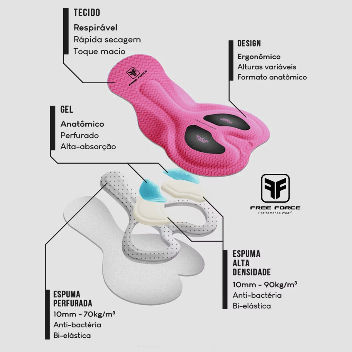 O destaque deste bretelle é o seu forro em gel. O forro Invert Air Gel com tecnologia avançada desenvolvida e produzida 100% no Brasil, com diferentes camadas de materiais que atuam harmonicamente para garantir a melhor experiência e conforto. Essa tecnologia oferece amortecimento e suporte em áreas-chave, como a região do períneo, reduzindo significativamente o desconforto e a fadiga durante pedais longos. Possui uma camada de espuma de alta densidade de 10 mm 90 kg/m³ anti-bactéria e bi-elástica, e uma camada de gel anatômico perfurado de alta absorção. O gel distribuído de maneira uniforme proporciona uma sensação de conforto ao se adaptar aos contornos do corpo.