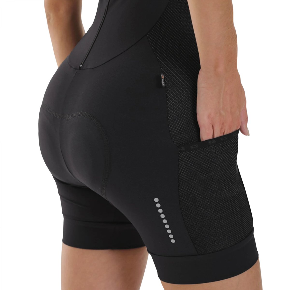 O forro Coolmax com espuma e gel atóxico, perfurado para melhor ventilação, está estrategicamente posicionado na área dos ossos isquiáticos, proporcionando conforto e absorção de impactos. A bermuda possui corte em ribana elástica para ajuste anatômico, e conta com dois bolsos para praticidade durante o pedal. Detalhes refletivos aumentam a segurança em condições de baixa luminosidade.