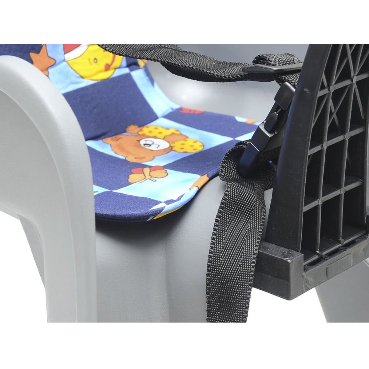 Os apoios para os pés possuem ajustes de altura, possibilitando a adaptação conforme o tamanho da criança. Além disso, alças de segurança são projetadas para manter as pernas da criança firmes na posição, evitando movimentos indesejados. A cadeirinha tem capacidade para suportar até 15 kg, sendo construída com materiais como nylon e polímeros, que conferem durabilidade e leveza.