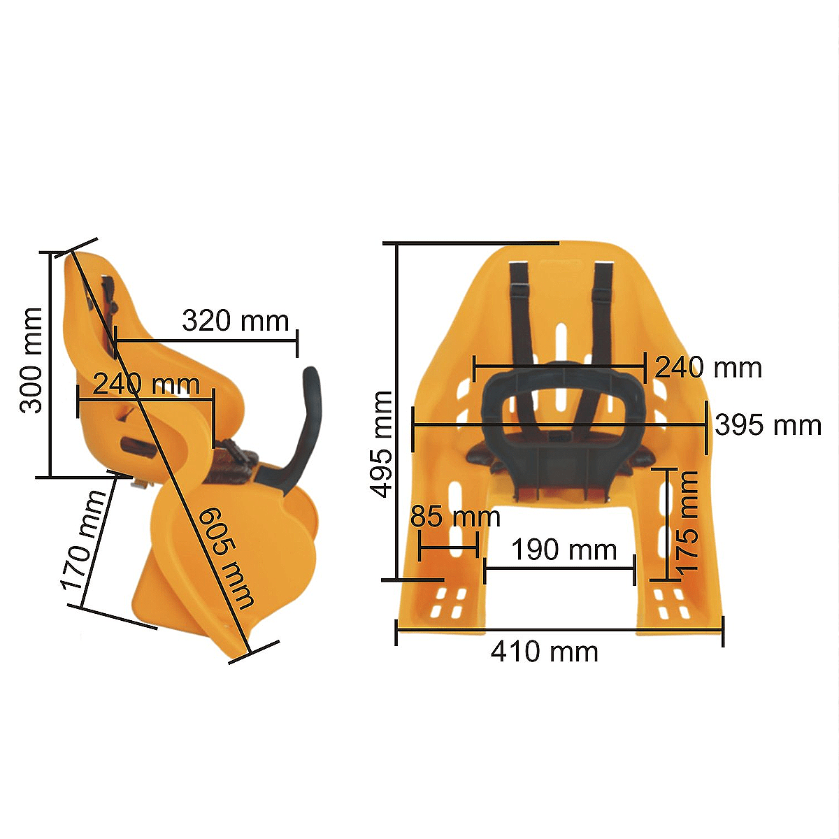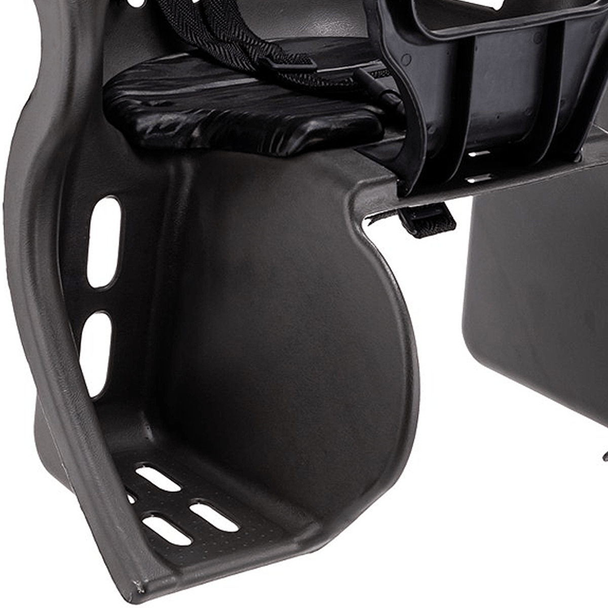 Para maior segurança, a cadeirinha é robusta, produzida com plástico polipropileno (PP) de alta resistência, possui refletores traseiros, cinto de segurança de 3 pontos, conjunto metálico de fixação, talas laterais para proteção de pernas e pés e apoio para as mãos. Para maior conforto, a cadeirinha tem formato anatômico, com cantos arredondados e possui almofada de espuma (poliuretano) no assento.