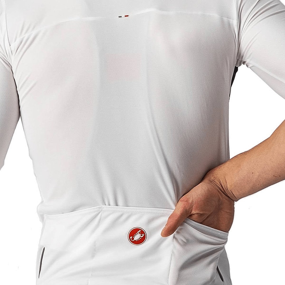 A Castelli adicionou nas mangas do produto o 4-Way Velocity Rev2 com ajuste próximo ao corpo e extremidades cortadas a laser. A camisa apresenta ainda zíper YKK Vislon invisível, 3 bolsos traseiros para que você possa carregar seus pertences e proteção solar total: o corpo principal é classificado com UPF 50, enquanto as mangas são UPF 30.