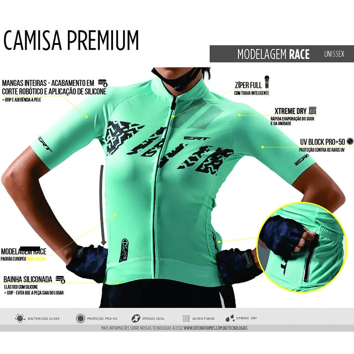 Tecnologia: Diversas tecnologias na peça, como o corte fino nas mangas, detalhes em silicone que evitam com que a peça se movimente durante o pedalar, design totalmente anatômico para se moldar ao corpo do atleta da melhor maneira e ainda possui o tecido na parte traseira mais comprido para evitar incômodos em posição de pedalada mais aerodinâmica, que é quando normalmente as camisas costumam subir nesta parte