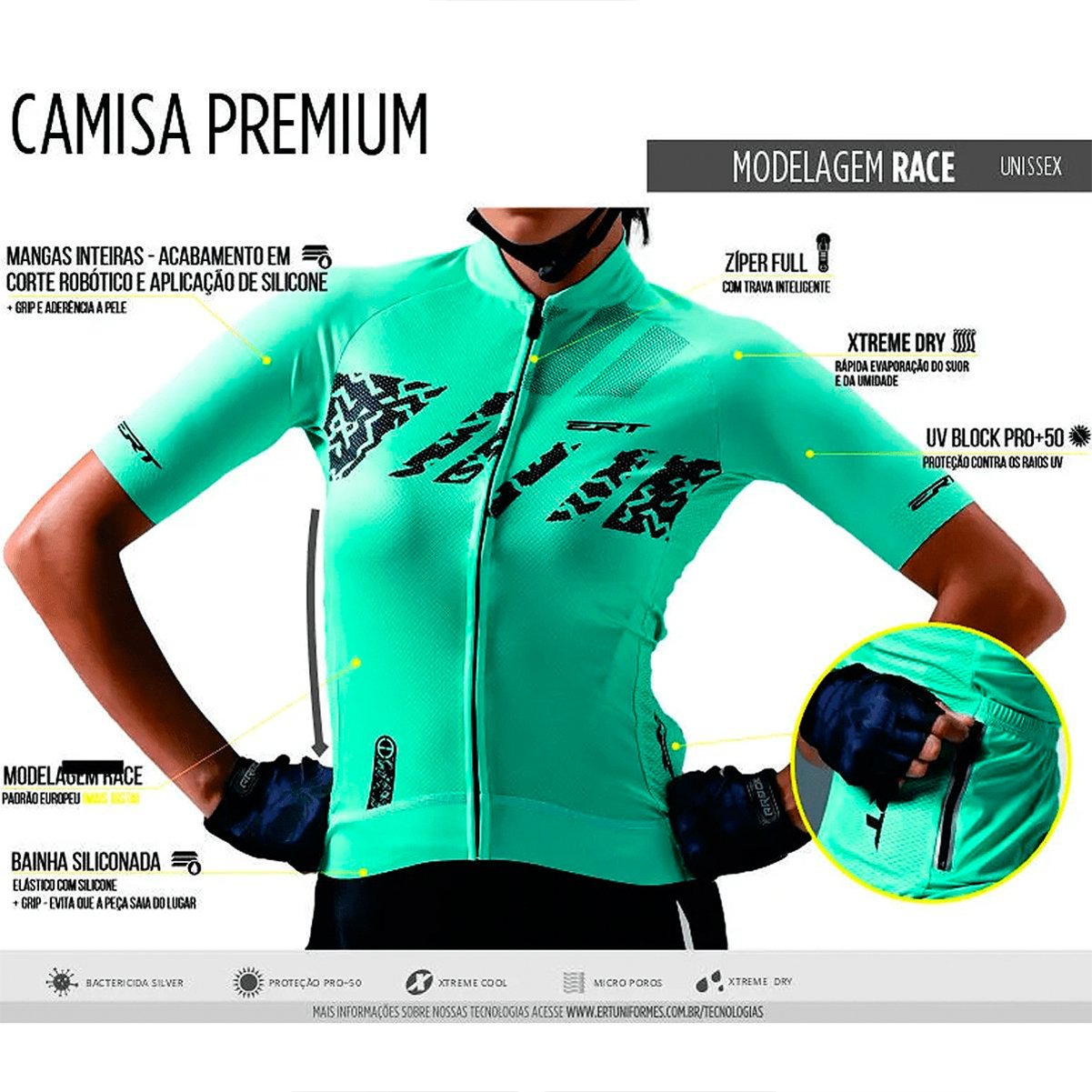 O zíper além de design, alto relevo personalizado e exclusivo ERT, conta com a tecnologia Stand By, uma trava inteligente que permite você controlar a trava, impedindo que ele abra enquanto você está em movimento. Avançada tecnologia que limita o crescimento das bactérias. Por isso, evita odores indesejados, descoloração e manchas, devido ao seu tratamento especial antimicrobiano que age nas fibras sem danificar sua estrutura. Esta camisa é projetada para atender às necessidades dos ciclistas e garantir que eles possam aproveitar ao máximo seu pedal.