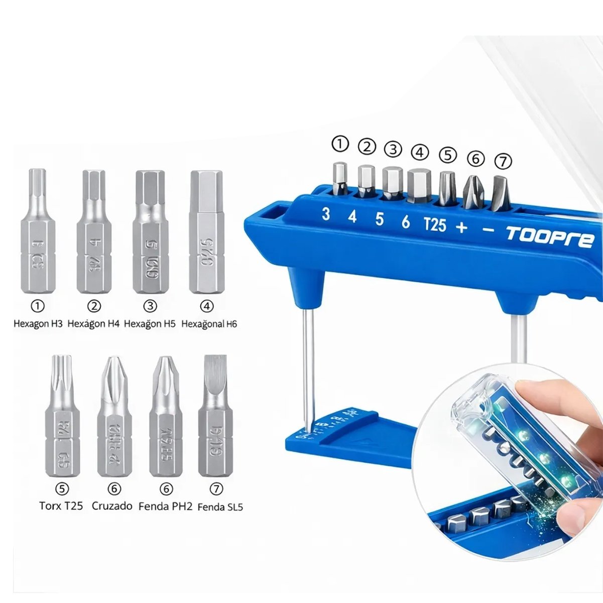 O grande diferencial deste kit está na qualidade dos materiais. As 7 pontas (bits) incluídas são fabricadas em Aço S2, um material de dureza superior que evita o desgaste precoce e não espana os parafusos. O estojo possui uma tampa com faixas magnéticas internas, que mantém as pontas organizadas e atrai os bits para evitar que caiam durante o manuseio no estradão ou na oficina. É a união perfeita entre praticidade e engenharia de ponta para o teu pedal.