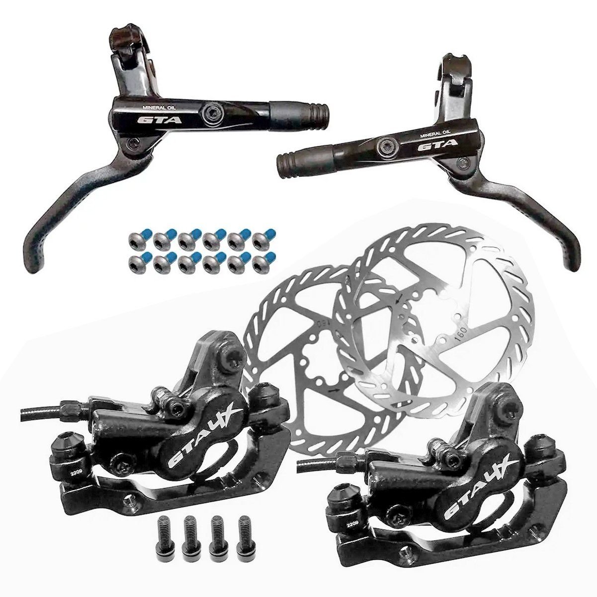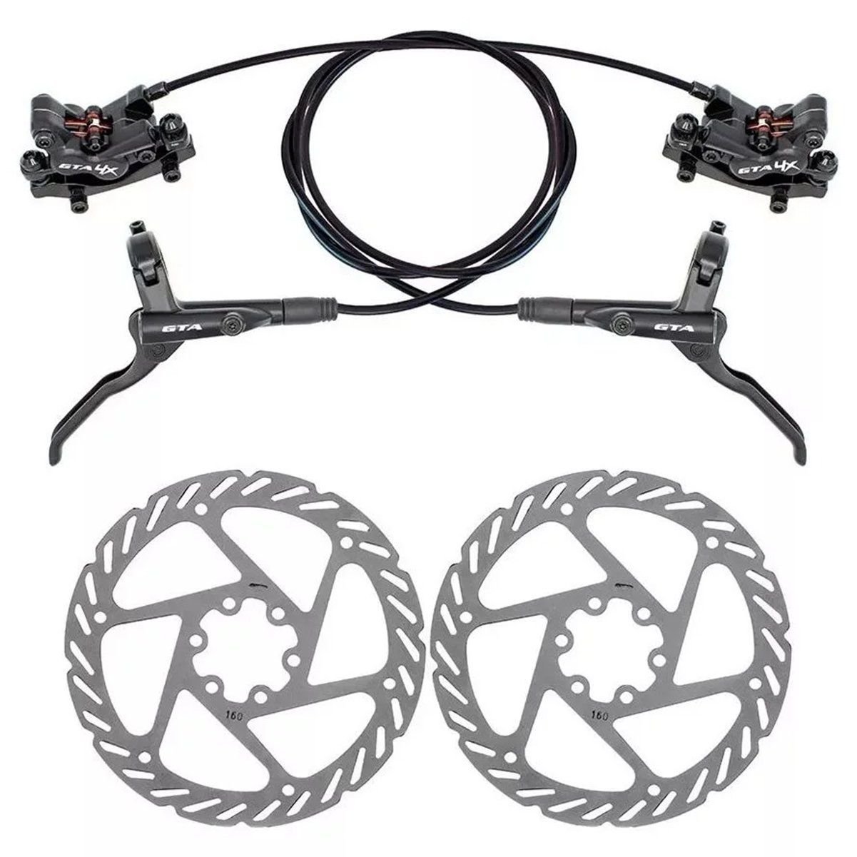FREIO DE BICICLETA GTA HIDRÁULICO DIANTEIRO E TRASEIRO COM ROTORES – 4 PISTÕES