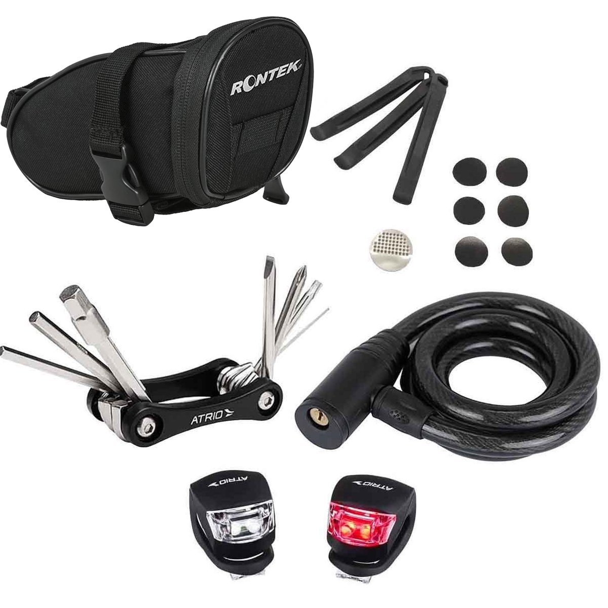 Kit Remendo Atrio Autoadesivo 6 unidades com 3 EspátulasCor: PRETO Tamanho: UKit Iluminação de Bicicleta Atrio Dianteiro e Traseiro Silicone LedCor: PRETO Tamanho: UCadeado para Bicicleta Atrio 8x1000mm com ChaveCor: PRETO Tamanho: UCanivete Atrio Mini 9 FunçõesCor: PRETO Tamanho: UBolsa Selim de Bicicleta Rontek AeroCor: PRETO Tamanho: U