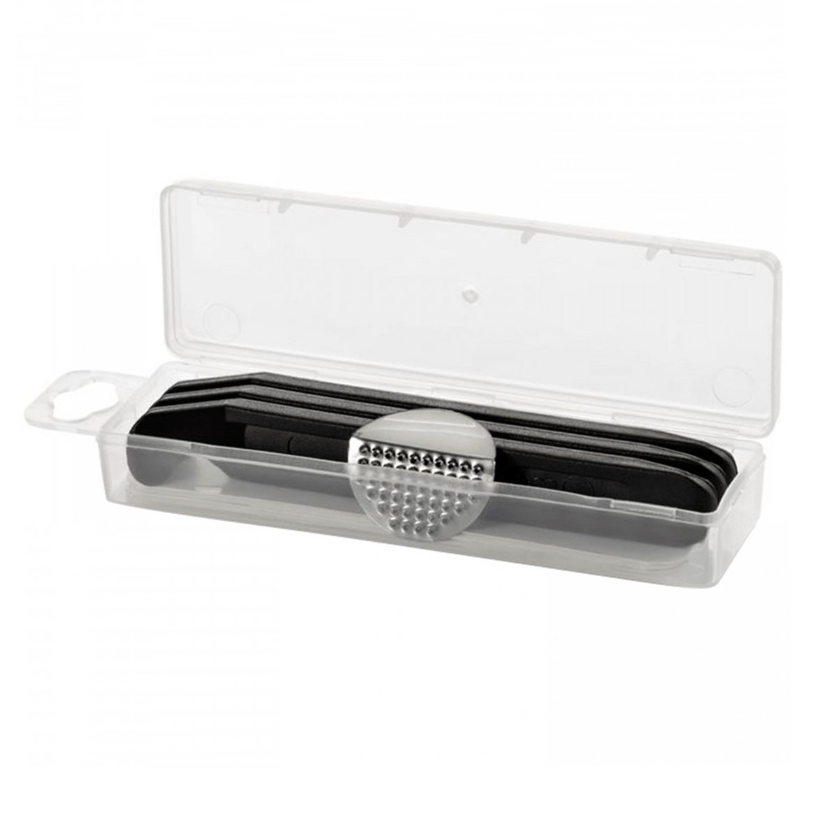 O kit contém três espátulas de nylon na cor preta, cada uma equipada com um ganchinho na ponta, são essenciais para a remoção e recolocação do pneu na roda, permitindo que o ciclista acesse a câmara de ar. O kit também inclui uma lixa metalizada, utilizada para preparar a superfície da câmara antes da aplicação dos remendos. A lixa remove resíduos e cria uma textura áspera na borracha, melhorando a aderência do adesivo dos remendos.