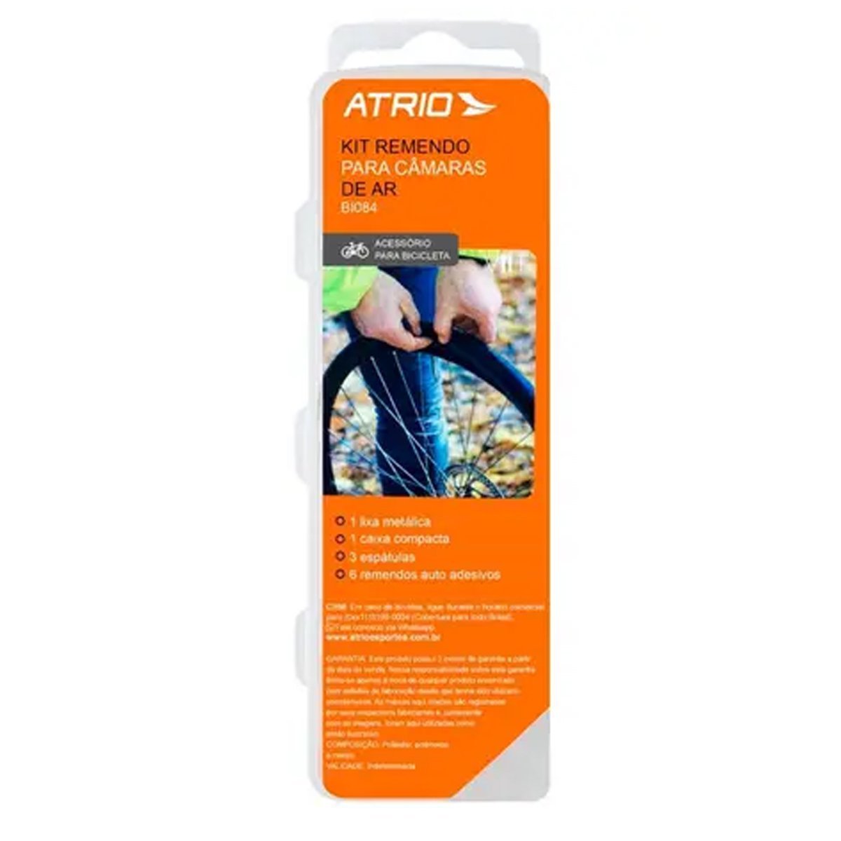 O Kit Remendo para Câmara Ar de Bicicleta Atrio BI084 é um conjunto rápido e eficiente para reparar perfurações nas câmaras. Este kit inclui seis unidades autoadesivas, que são remendos feitos de adesivo de alta resistência, garantindo uma aderência segura e durável sobre a área danificada da câmara de ar.