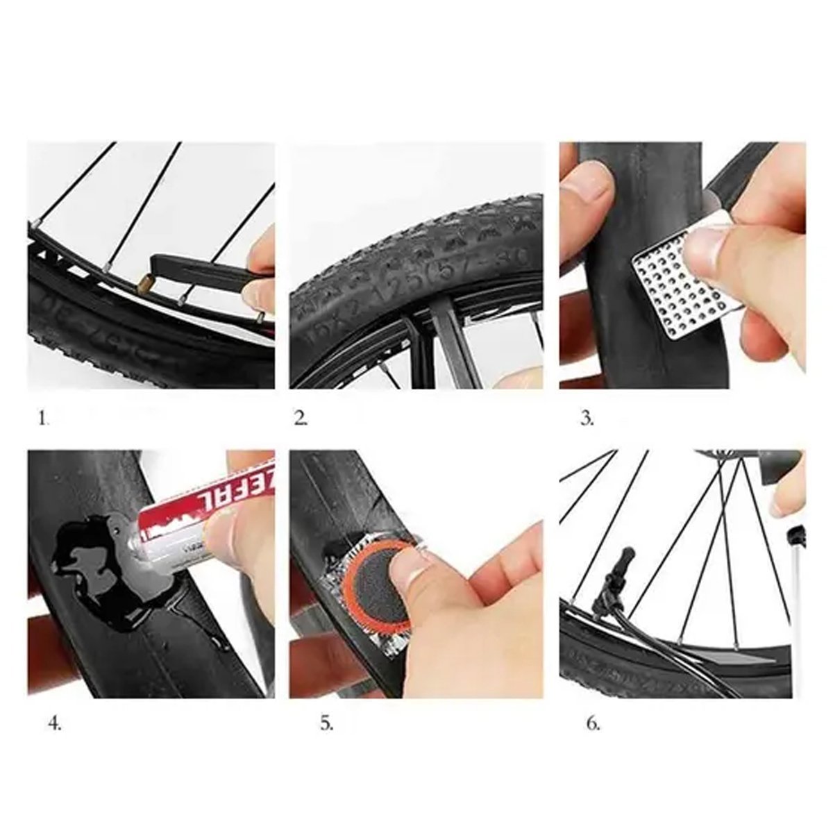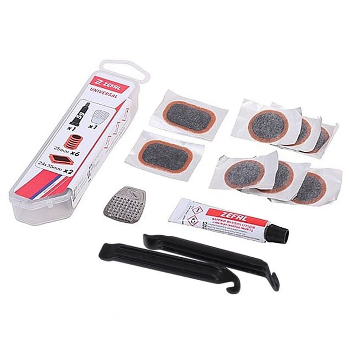 O kit também contém dois remendos medindo 24 x 35 mm. Estes remendos são indicados para cobrir furos maiores ou cortes na câmara de ar. Para preparar a área danificada antes da aplicação, o kit inclui uma lixa. A cola fornecida no kit vem em um tubo de 5 g. Esta cola especial é formulada para criar uma ligação forte e durável entre a câmara de ar e o remendo e por fim 2 espatulas de nylon