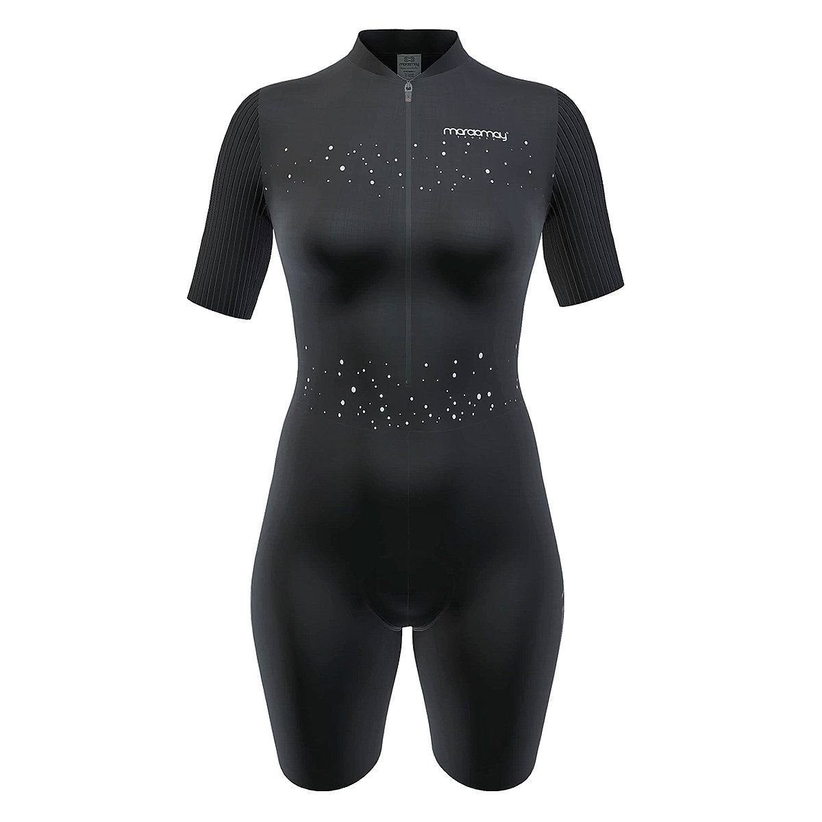 Macaquinho de ciclismo feminino Marcio May Moove Star preto, ideal para alta performance. Oferece aerodinâmica superior, conforto com forro CoolMax para até 9 horas, proteção UV 50+, gerenciamento de umidade e detalhes refletivos para segurança. Possui ajuste ergonômico com corte a laser e dois bolsos traseiros.