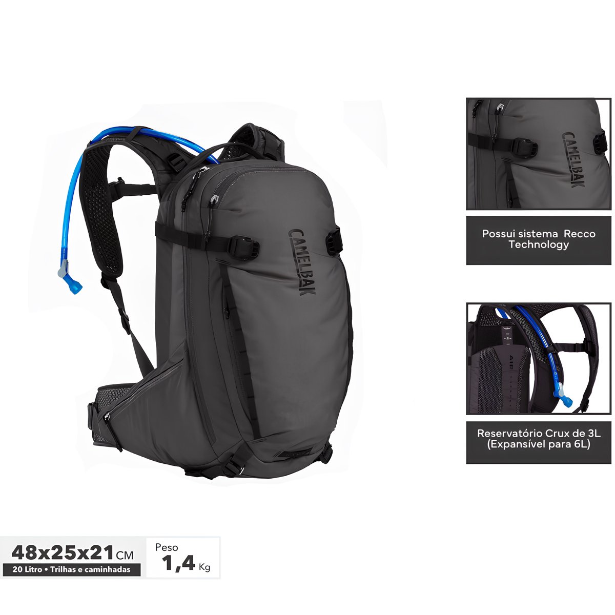 Conta com reservatório Crux de 3 litros e espaço para um segundo reservatório, totalizando até 6 litros de hidratação, com sistema QuickLink para troca rápida do tubo sem remover o reservatório. A organização inclui bolsos de carga na barrigueira, estojo integrado para ferramentas, bolso elástico para overflow, suporte para capacete, laço para luz e compartimento para baterias de e-bike.