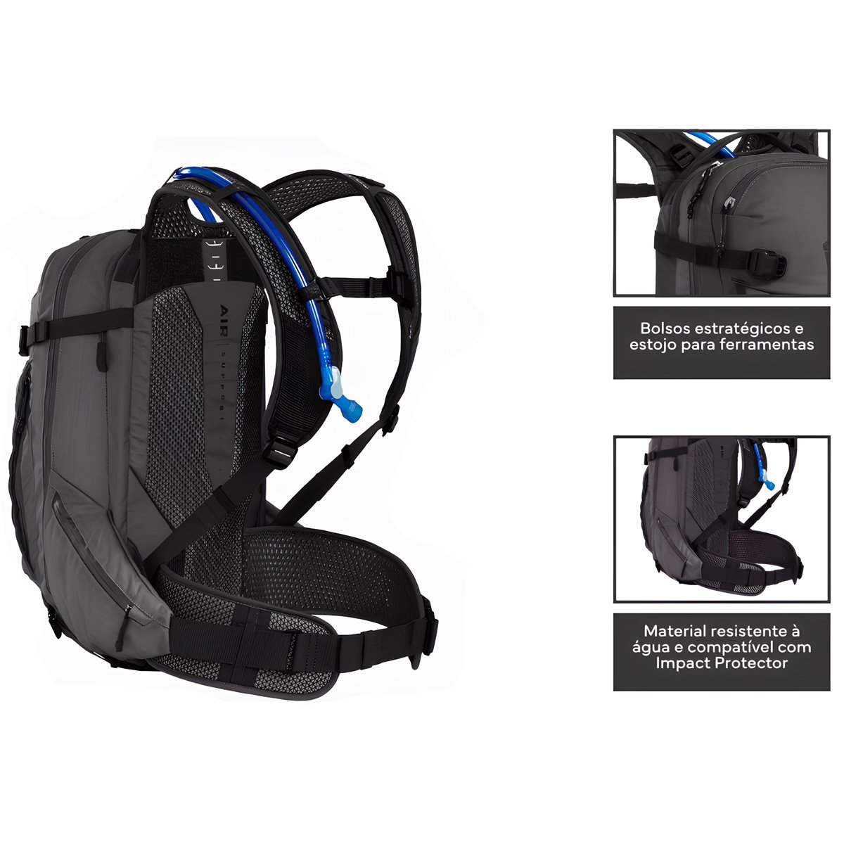 Fabricada em resistente Cordura® re/cor™, a mochila é à prova d’água e compatível com o Impact Protector™ e baterias de e-bike, garantindo durabilidade e versatilidade. O painel traseiro Air Support™ Pro, aliado ao arnês de malha ventilada 3D, proporciona excelente ventilação e ajuste ergonômico para maior conforto durante o uso prolongado.
