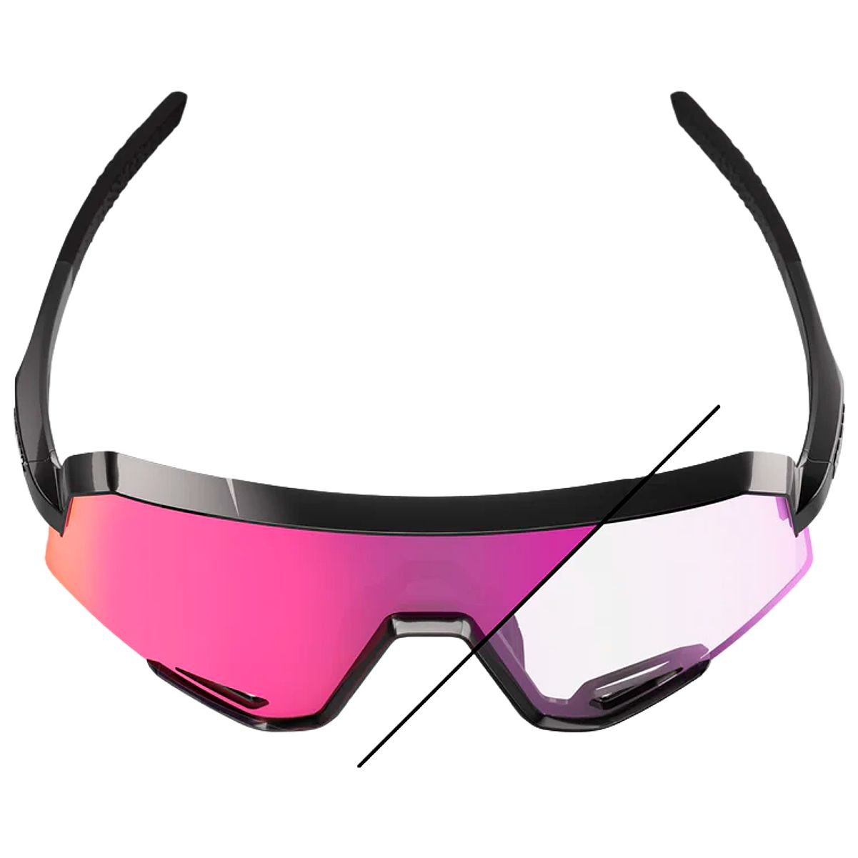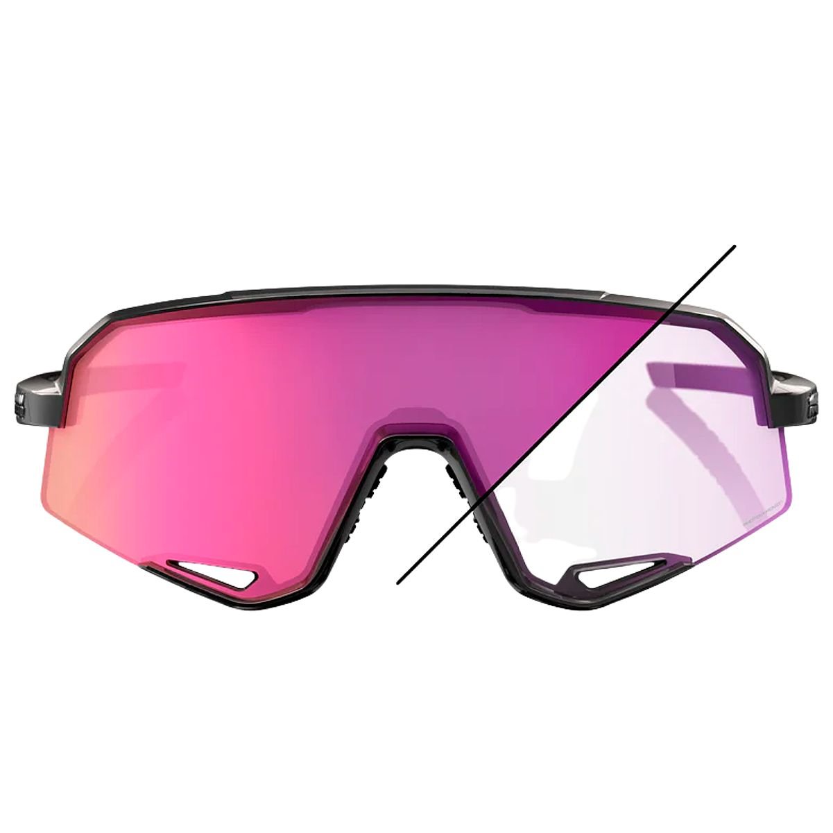 Óculos de ciclismo 100% Slendale Purple Mirror Fotocromático, com lente que se adapta automaticamente à luz, oferecendo visão de alta definição e otimização de cores. Possui design leve (95g) e armação ergonômica para conforto e estabilidade em qualquer terreno.