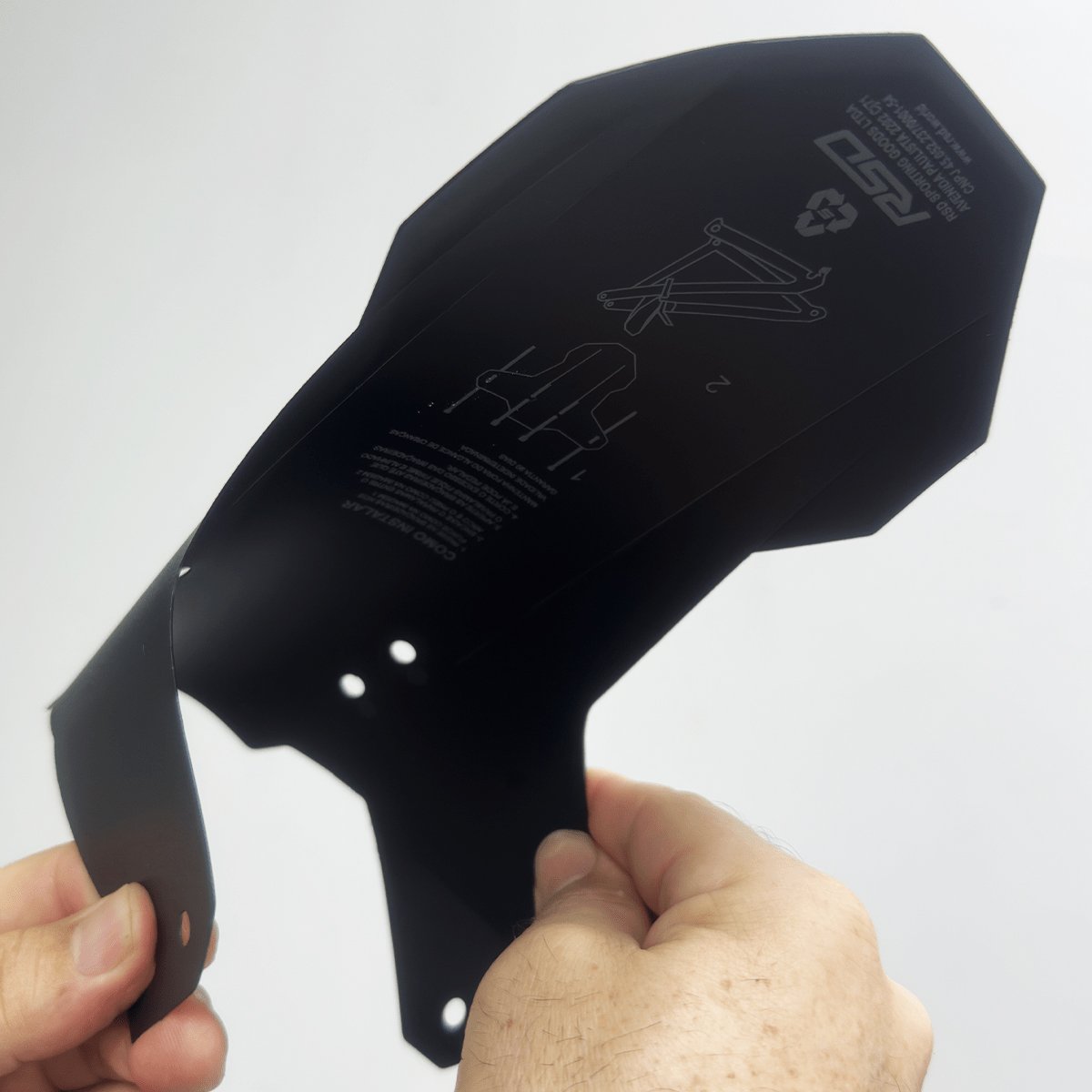 O paralama dianteiro da RSD é capaz de proteger o ciclista contra tudo que é lançado pela tração do pneu dianteiro Sobretudo protege a bicicleta e a suspensão que é o componente que mais fica exposto ao pneu dianteiro. Fixado apenas por cinta de nylon, conhecido como “enforca gato”, o paralama dianteiro apresenta um grafismo de cor branco. Linhas em relevo negativo instruem o ciclista caso aja necessidade de dobrar a peça para melhorar o design visual com a bicicleta. O Paralama RSD Mud No More é leve e pode ser instalado em qualquer bicicleta.