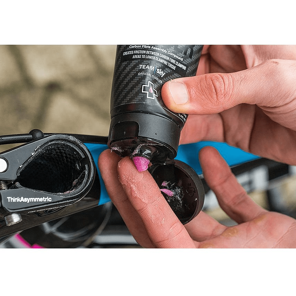 Simplificando, a equipe Muc-Off criou um composto de montagem de componentes de fibra de carbono altamente eficiente que é essencial para evitar o aperto excessivo e criar um atrito de união seguro entre superfícies de carbono ou mesmo peças de carbono para metal.