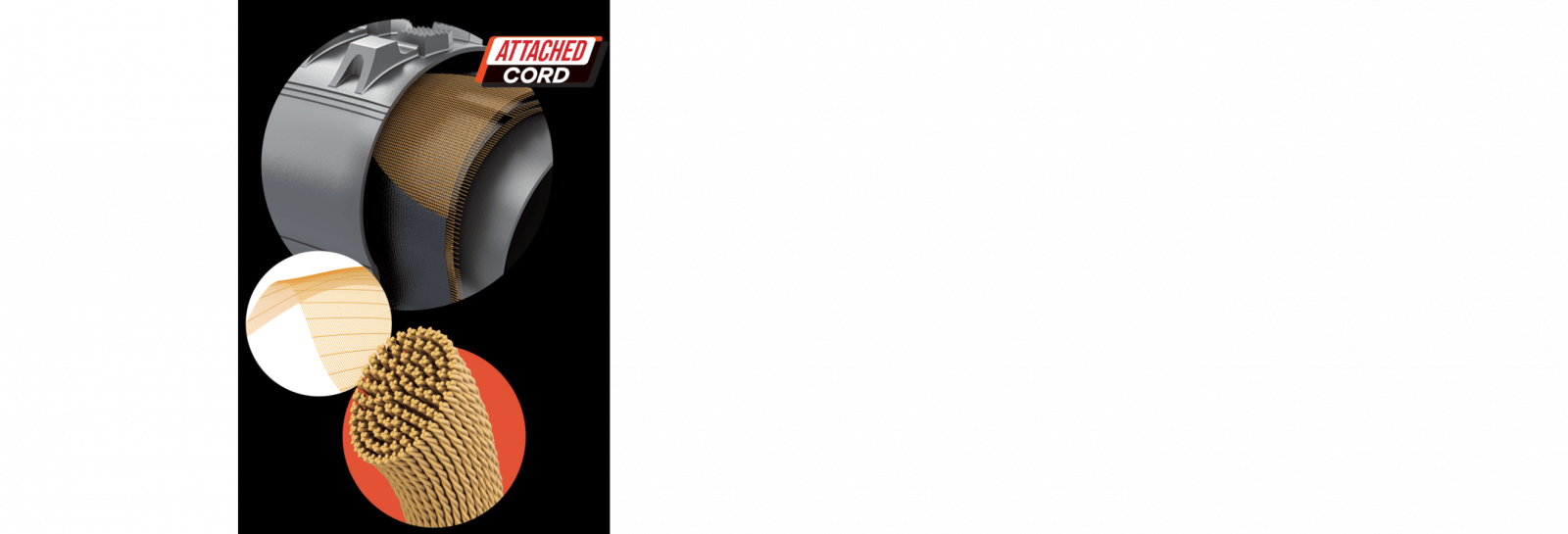 Elevada resistência mecânica, com tecidos Attached Cord de poliamida (Nylon). É a fibra sintética de maior tenacidade utilizada em pneus diagonais. Em cada centímetro, são mais de 10 cabos de Nylon. Um conjunto que forma uma estrutura muito reforçada, para resistir aos impactos e suportar altas cargas. Os tecidos Attached Cord em nylon recebem específico tratamento superficial com resina de alto peso molecular, que asseguram excelente união química com a borracha natural nativa da Amazônia e mantém os múltiplos filamentos e feixes, coesos e firmes.