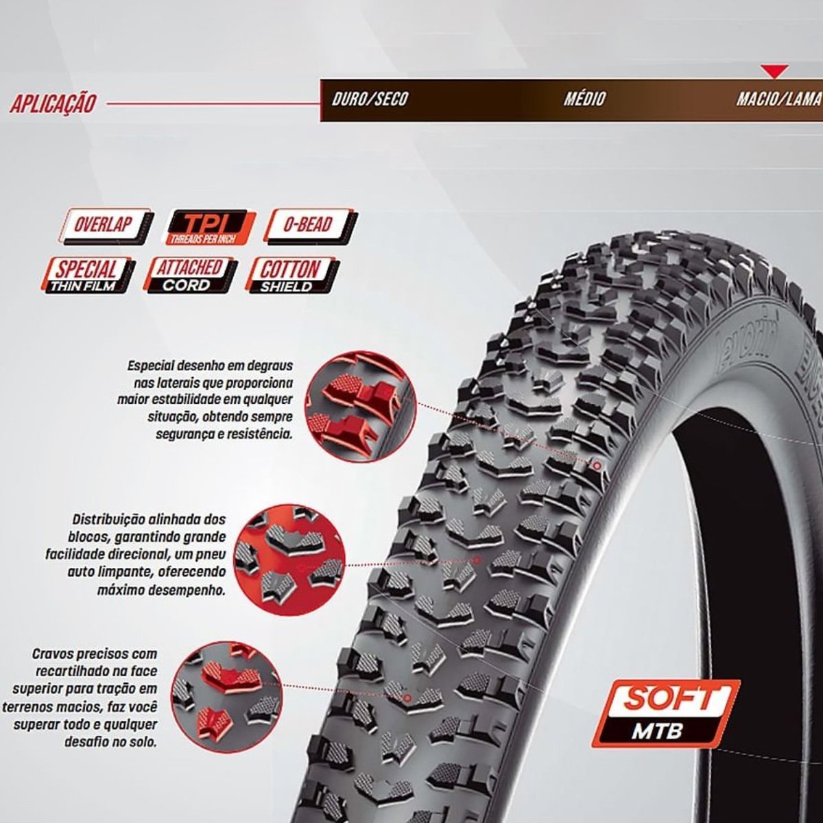 Tecnologia Cotton Shield - Tecido a base de fibras naturais, o algodão emborrachado com material de elevada resistência à abrasão, posicionado na região do talão, promove uma excelente vedação (não deixa ar sair e nem sujeira entrar), total aderência e ajuste do produto ao aro, aumentando a vida útil do pneu, mesmo quando em terreno irregular de alto impacto, reduzindo a fricção com as asperezas da roda. Oferece segurança, resistência e robustez.