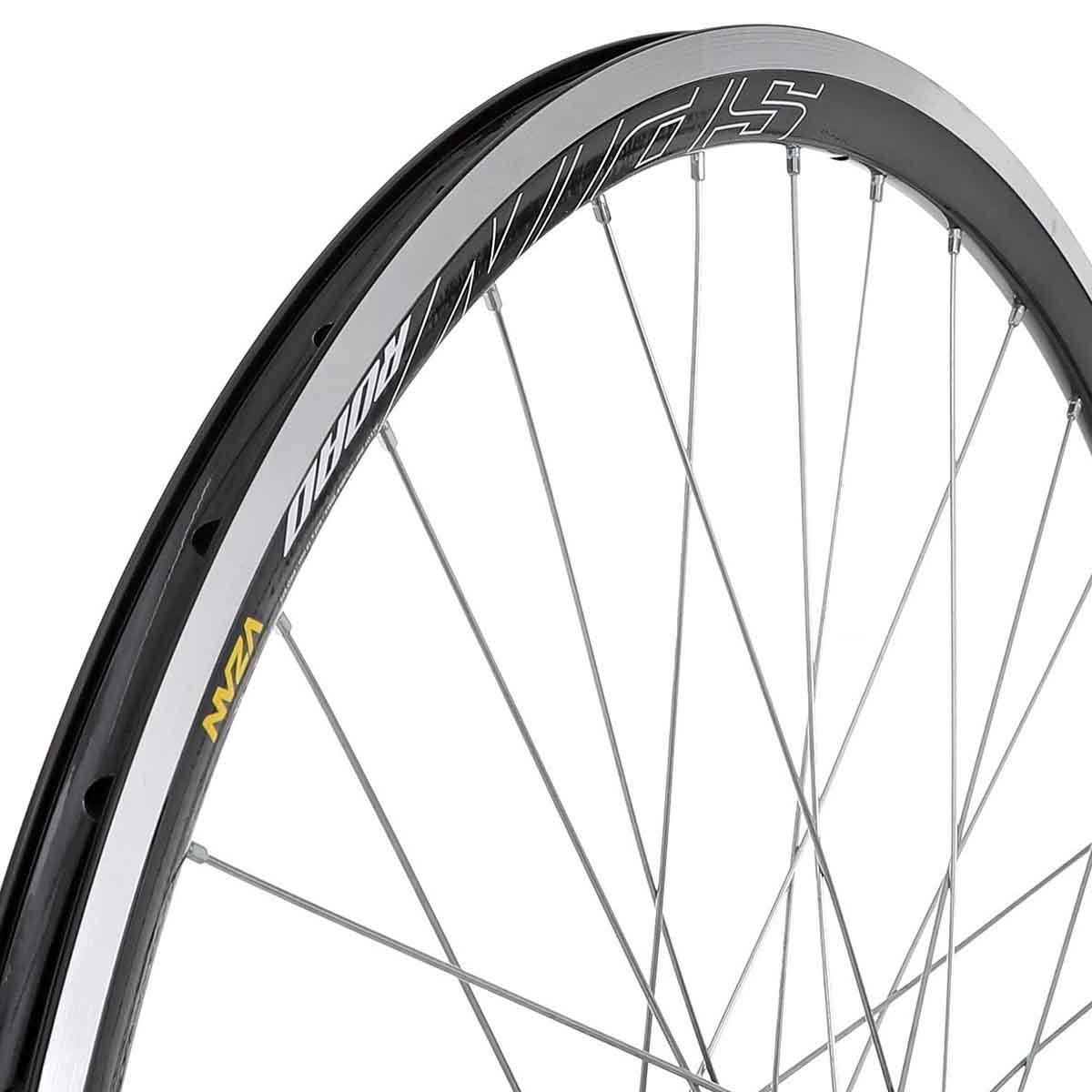 Com aro em alumínio e perfil de 30mm, a Vzan Spin Road proporciona boa rigidez estrutural e rodagem consistente. O conjunto utiliza cubos Absolute na dianteira e na traseira, ambos com 36 furos, favorecendo a distribuição uniforme de tensão dos raios e maior durabilidade em uso contínuo.