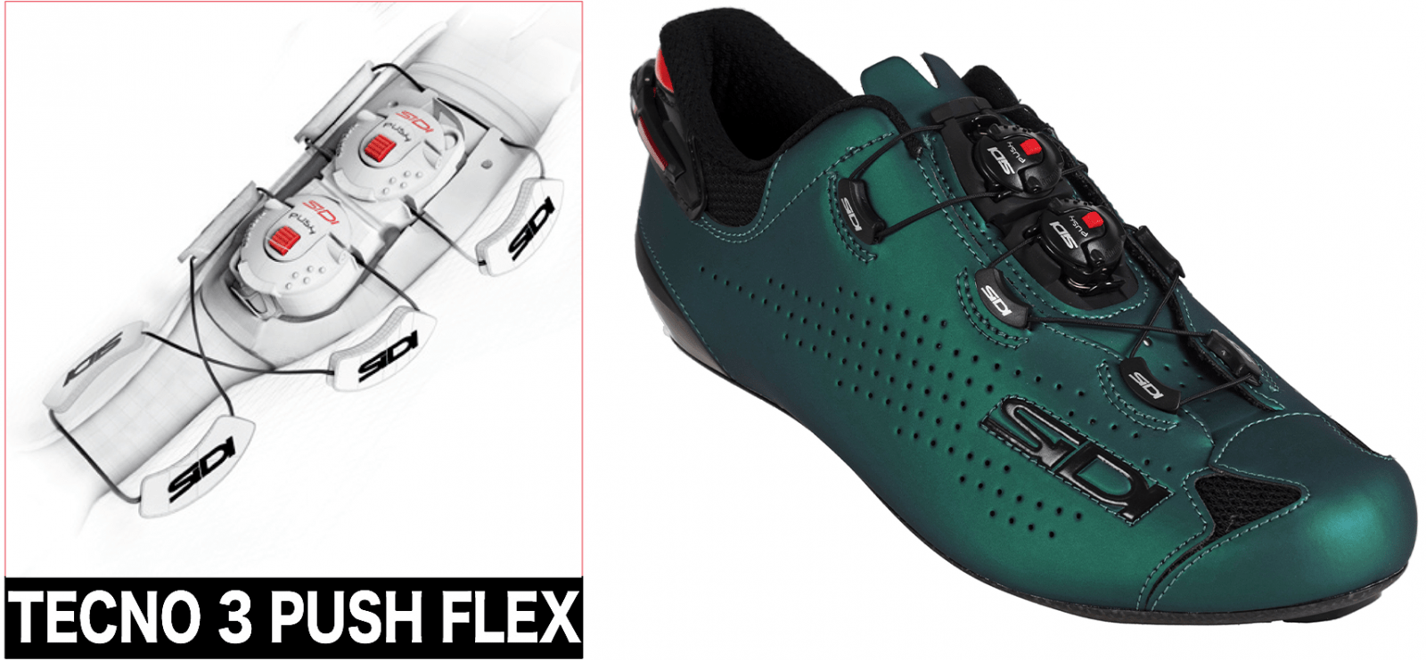 O Tecno-3 Push Flex elimina completamente a zona de pressão no peito do pé e melhora significativamente a sensação de fechamento. Dotado de uma superfície de apoio menor na região da lingueta da sapatilha, com sistema de flexão central, consegue acompanhar as diferentes necessidades e conformações dos vários ciclistas, sem criar zonas de hiperpressão. Garante ajuste micrométrico, velocidade de fechamento/liberação de tensão e é substituível.