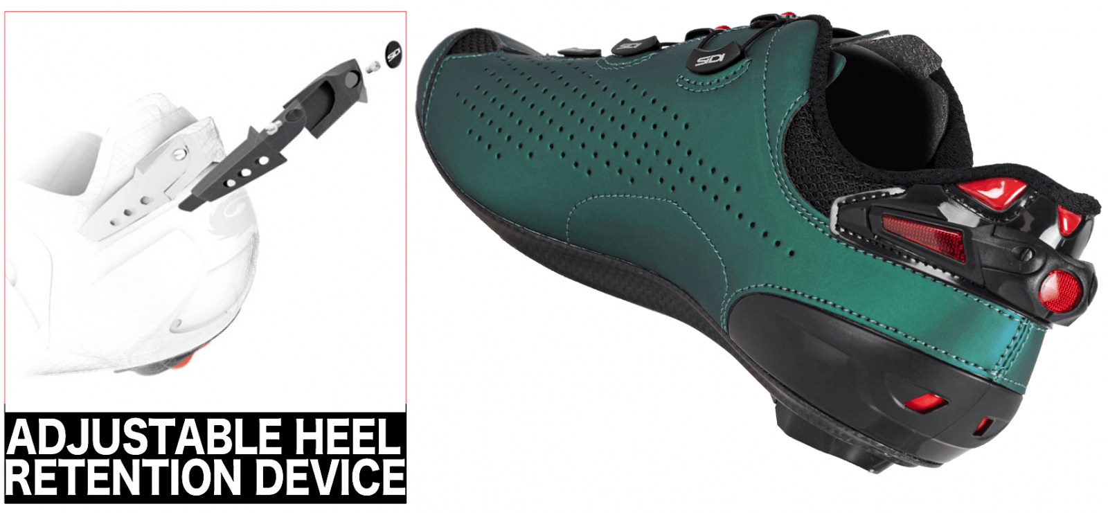 A Sidi Shot 2 apresenta ainda, dentro de todas as novidades, em seu calcanhar ajustável, refletores integrados. Para segurança adicional ao pedalar, o novo dispositivo de retenção de calcanhar ajustável é fornecido com inserções reflexas para maior visibilidade em condições de escuridão.